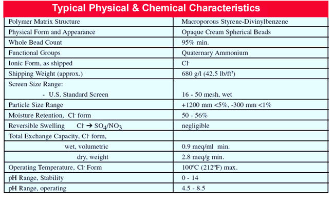 Sodium chloride is generally preferred for regeneration for reasons of cost and efficiency. When available sea water can be used quite effectively. The use of softened water for make up of regenerant and rinse is often recommended to avoid the precipitation of calcium carbonate in and around the CQ-N250 (or any other resin used in this application). Although the precipitation is not particularly detrimental in the short term, the long term effects may include increased resin attrition and leakage of nitrates. |
