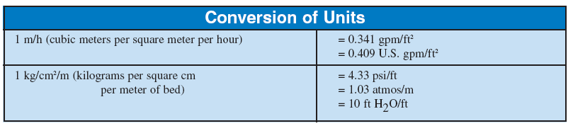 During upflow backwash, the resin bed should be expanded in volume by between 50 and 70%. This operation will free it from any particulate matter, clear the bed of bubbles and voids, and reclassify the resin particles, ensuring minimum resistance to flow. Bed expansion increases with flow rate and decreases with temperature, as shown in Fig. 2. Care should be taken to avoid over expansion of the bed. |