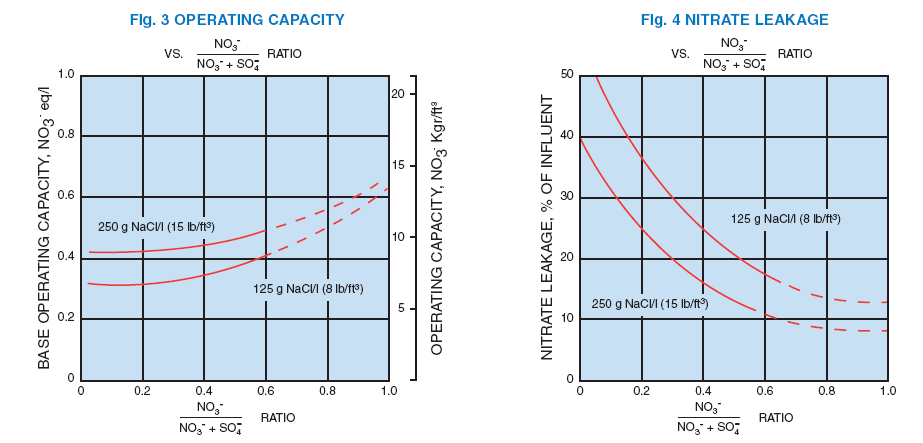 Fig. 3 and Fig. 4 give the operating capacity and nitrate leakage respectively which may be obtained using cocurrent regeneration at the given regeneration levels. Values obtained from Fig. 3 are expressed in terms of nitrate throughput, corrected for nitrate leakage, and hence may not be used directly to determine the throughput of water. All ion concentration values are either on a ppm or a meq/l basis for ratio determination.