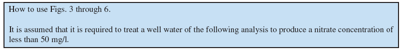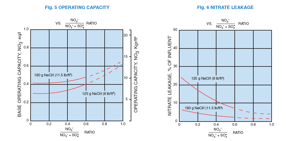 Depending upon the throughput requirement the resin volume is chosen so as to operate within the flow rate stipulations given in the standard operating conditions above. A design factor of 0.9 is also recommended as is customary. Hence throughput/liter of resin for design purposes will be 313 x 0.9 = 281.7 liters (2124 U.S. gal/ft3). In this example the leakage is 17.3 ppm as CaCO3 (21.4ppm as NO3), hence the useful option to blend treated water with raw water on a 50% basis could be applied. It would be of no advantage to move to counter-current regeneration in this case. Reference to Fig. 5 will show that the basic capacity curve is very similar. However the throughput will be lower, because the reduced leakage increases the ion exchange load for a given throughput. When on the other hand nitrate concentrations or ratios are higher, it may be advantageous to operate counter-current rather than increase the regeneration level while operating co-current. In this way a suitable blend may be obtained with lower regenerant costs (and costs of disposal).
