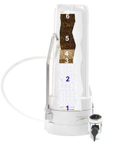 | Water travels through multiple stages of filtration: In stages 1 and 6, Water flows through pre and post one - micron filter pads (1 micron equals 1/25,000th of an inch), which remove suspended particles such as silt, sediment, cyst (Giardia, Cryptosporidium), sand, rust, dirt, and other un-dissolved matter In stage 2, water flows through a FLUORIDE REMOVAL media containing Fluoride Charcoal Granulated Activated Carbon (GAC). This media is specifically designed to have a high affinity for Fluoride, Lead and Arsenic. It removes metals through a mixture of adsorption and chemical reaction with the media; therefore, the elimination is not reliant on ion exchange. It has a uniform particle size, is physically stable and can be used over a wide pH range. Capacity: 4500 ppm Fluoride (Avg. 1000 to 1500 Gallons). As high as 11000 ppm F+ with effluent levels below 0.2 ppm from 10 ppm F+ feed. In stages 3 and 4, Water flows through a bed of media made of a special high-purity alloy blend of two dissimilar metals - copper and zinc (KDF-55D ®, and KDF-85D ®.) KDF is a major advancement in water treatment technology that works on the electro-chemical and spontaneous-oxidation-reduction (REDOX) principles. Chlorine is instantaneously and almost inexhaustibly oxidized. Tests on KDF/GAC cartridge have shown 99+% chlorine removal past 20,000 gallons of water. In comparison, carbon cartridges of comparable volumes drop below 90% effectiveness after only 4,000 gallons. Click here to learn more |