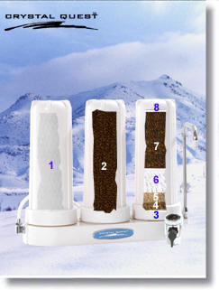| magnet. The media inhibits bacterial growth throughout the entire unit. In fact, it has been shown to be reduced up to 90%, eliminating the need for silver, which is commonly used in carbon-only filters (silver is considered a pesticide by the EPA and, as such, must be registered with them). Is copper or zinc added to the water in any significant amount? On 2.3 ppm chlorinated water, <0.05 mg/l copper and only 0.46 mg/l zinc were measured. The EPA aesthetic levels are 1.0 mg/l for copper and 5.0 mg/l for zinc. Both zinc and copper are essential minerals for good health - the FDA recommends a daily intake of 15 mg of zinc and 2 mg of copper. Click here to learn more about KDF In stage 6, Water flows through ion exchange resins, reducing heavy metals such as lead, copper, aluminum, and water hardness. In stage 7, water flows through granulated activated carbon (GAC). GAC is universally recognized and widely used as an effective adsorbent for a wide variety of organic contaminants, such as chlorine (99.9%), chemicals linked to cancer (THM's, benzine) pesticides, herbicides, insecticides, volatile organic compounds (VOC's), PCB's, MTBE's and hundreds of other chemical contaminants that may be present in water causing bad taste and odors in your drinking water. Carbon is extremely porous and provides a large surface area for contaminants to collect. Carbon-only filters must also use their capacity for chlorine removal, resulting in a shortened life. They also may use a bituminous coal carbon, which is good at removing chlorine, but not as effective at removing chemicals. We use a high-grade coconut shell carbon that is most effective at removing chemicals. Coconut shell carbon provides a significantly higher volume of micro-pores than either coal, wood or lignite based carbon. As a result, it is more effective than other carbon types in removing trihalomethanes (THM's) and other chemicals from municipally supplied water. Since our REDOX media removes the chlorine before it reaches the carbon, the carbon capacity is not wasted on chlorine and is free to concentrate more effectively on organic contaminants. Click here to learn more about GAC In stage 8, water flows through another one-micron filtration pad for further reduction of undesirable particles. The end result is a great reduction or total elimination of a wide variety of contaminants. |